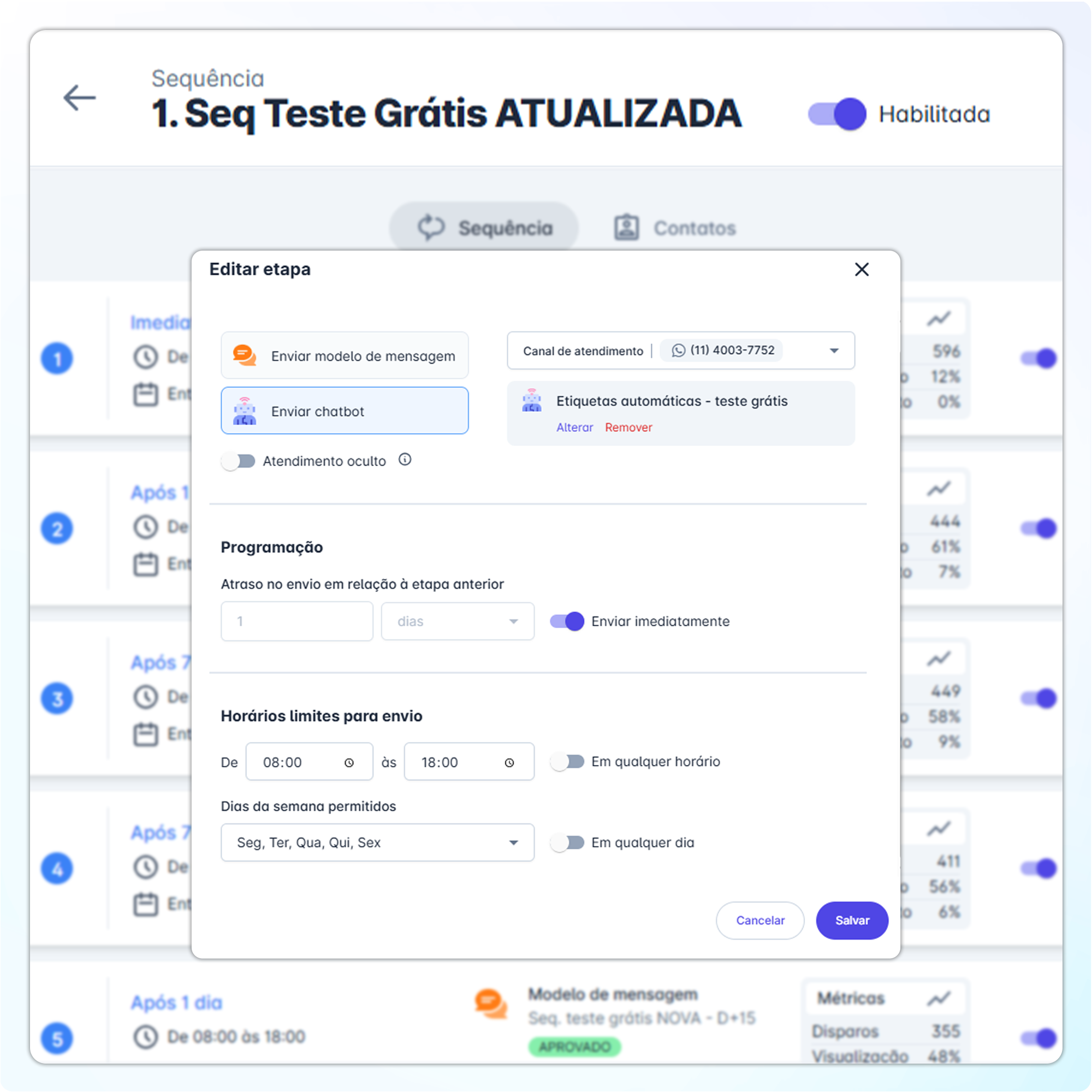 Monte a sequência: vincule os modelos e defina horários e dias de envio.