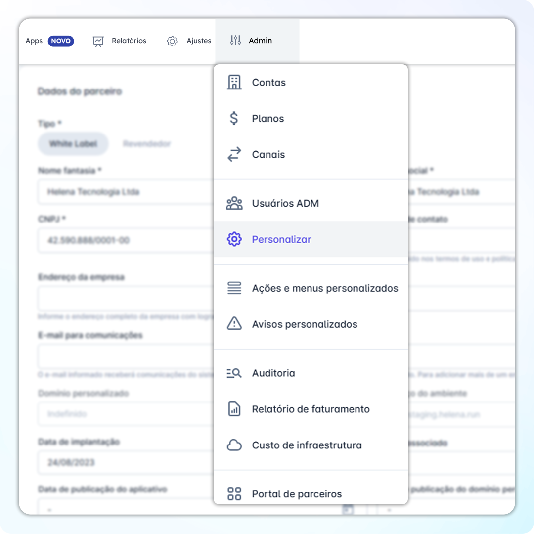 A funcionalidade permite adicionar menus em áreas do produto (ex.: Relatórios, Apps, CRM)