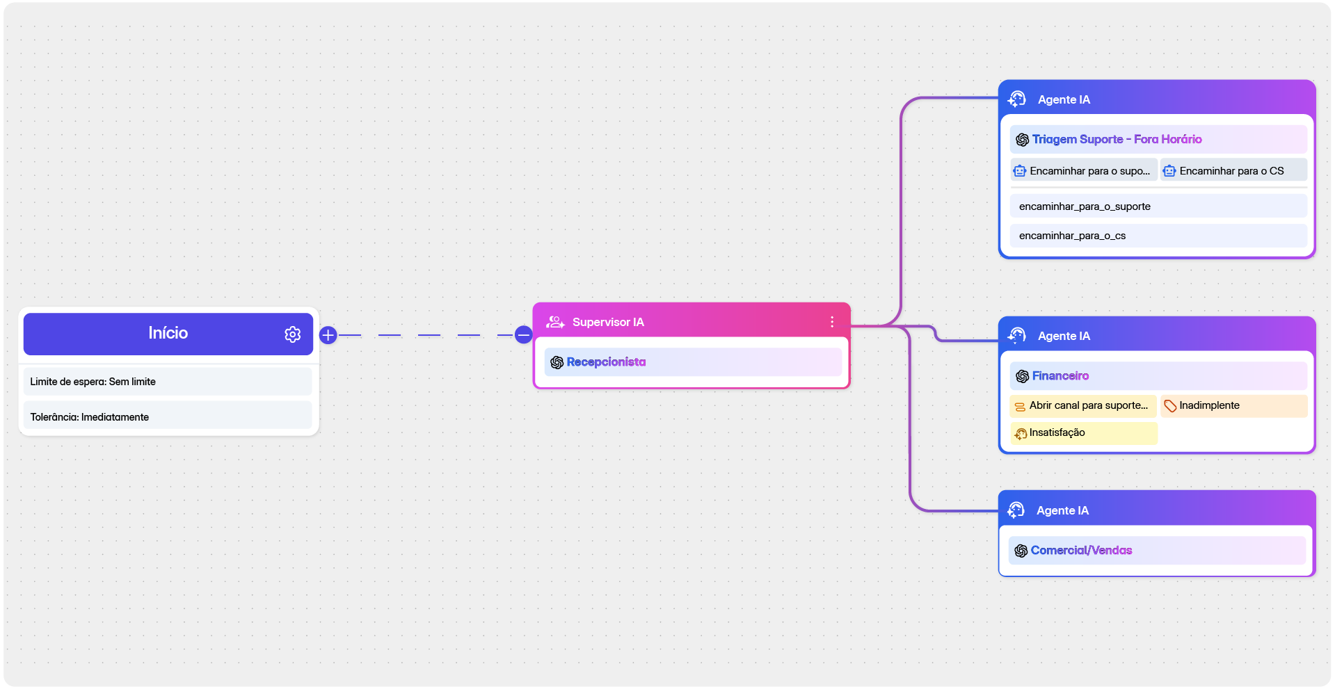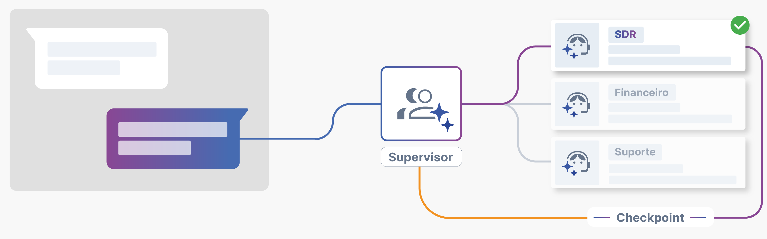 Tenha um Supervisor de IA monitorando cada conversa em tempo real, entendendo a intenção da mensagem, aplicando regras de negócio e acionando o agente mais adequado, tudo de forma automática.