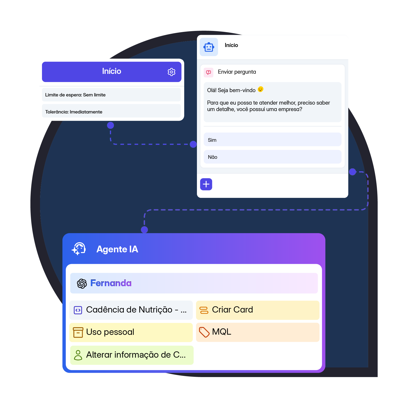 Tenha múltiplos Agentes de IA atuando juntos em uma mesma conversa. Eles respondem, consultam dados, acionam fluxos e qualificam leads, tudo de forma coordenada, sem confusão e sem perda de contexto.