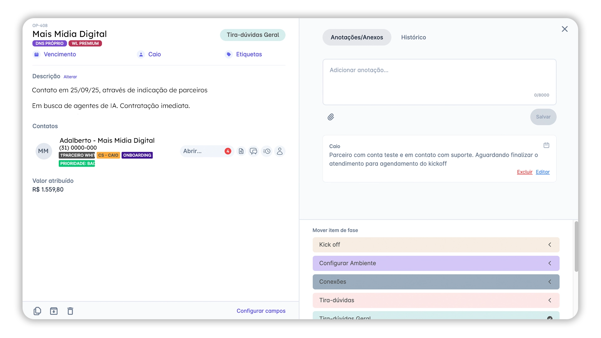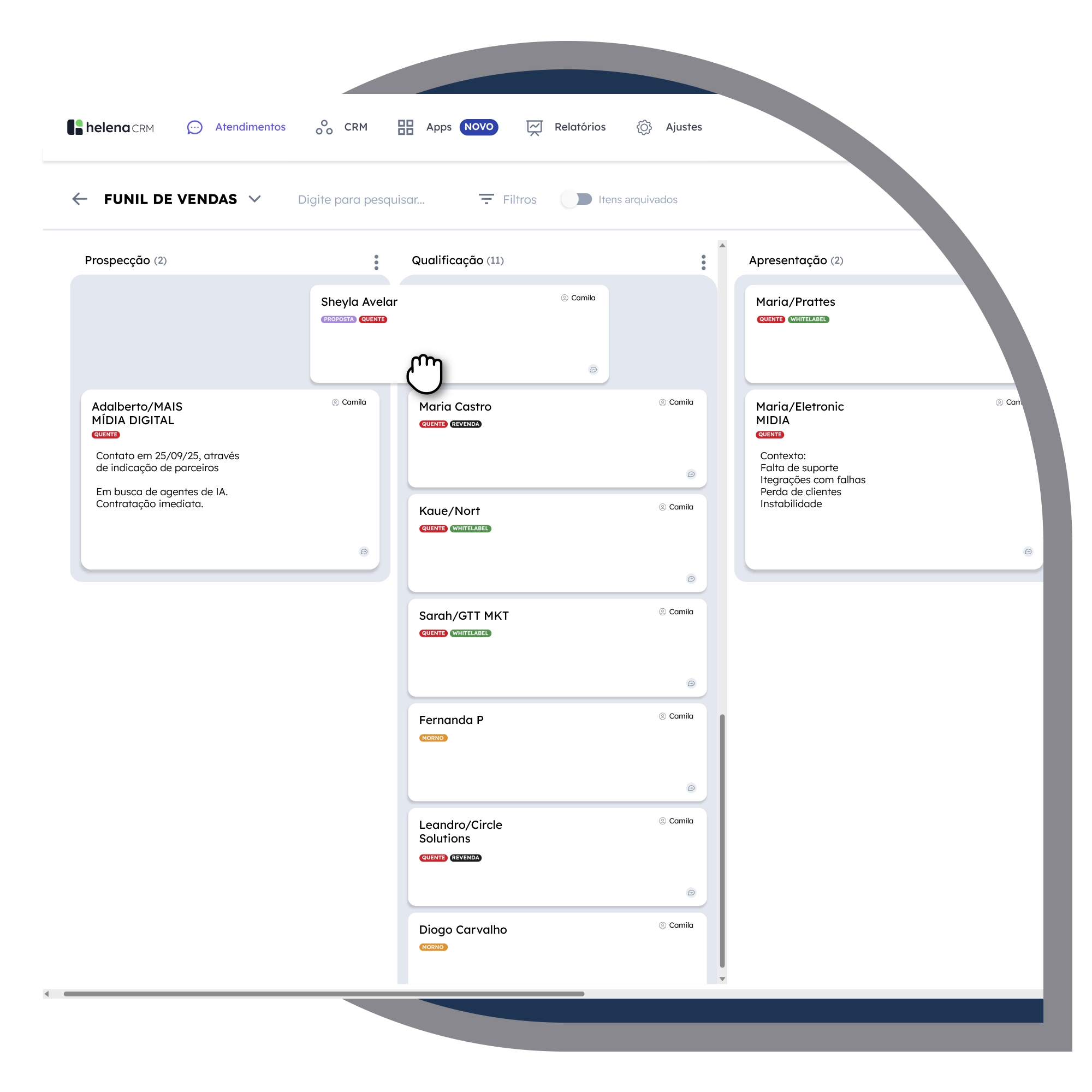 Cada oportunidade fica atrelada à conversa de origem. Tudo conectado e Integrado.