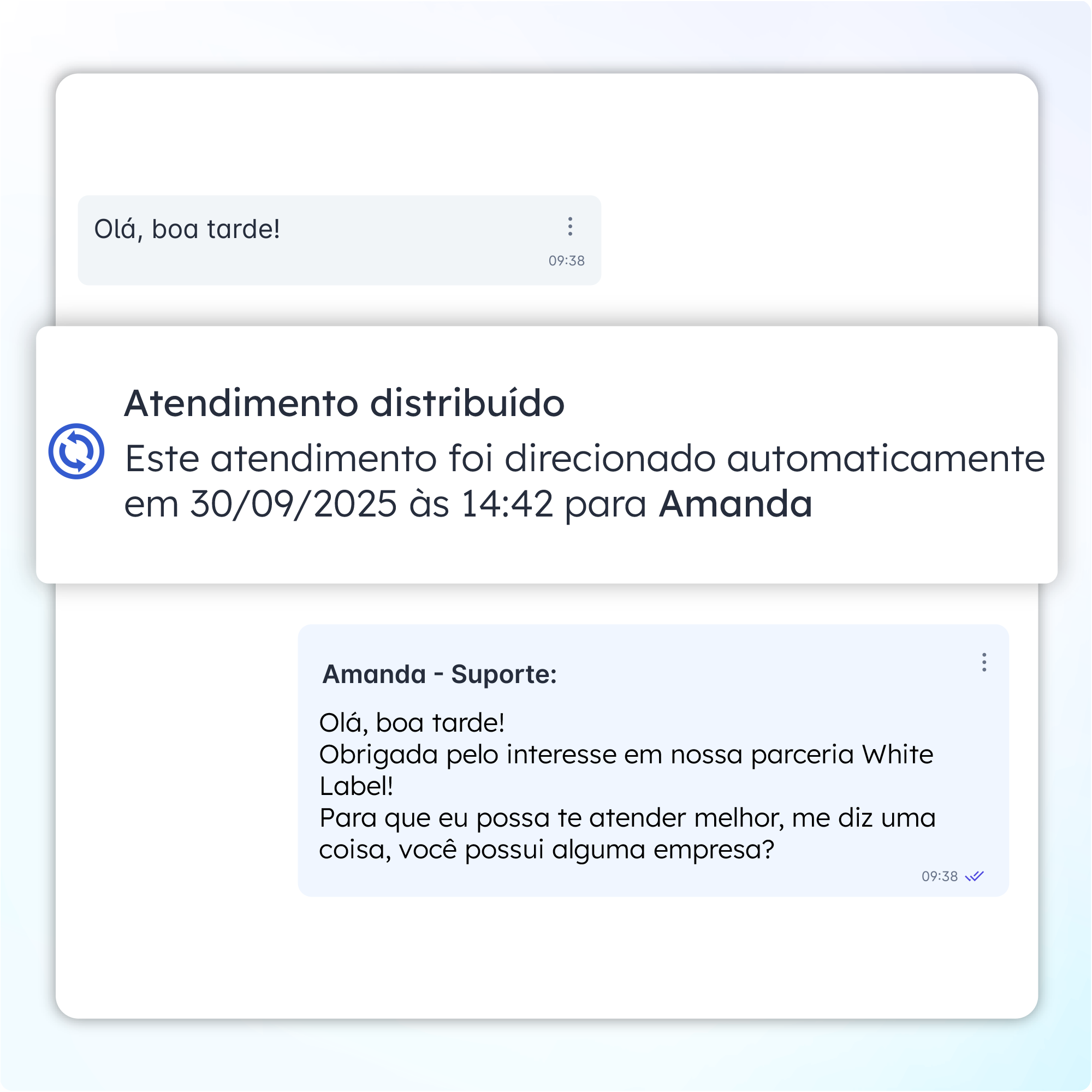 Cada nova conversa vai para o atendente certo, na hora certa. Se ninguém assumir no tempo definido, o transbordo repassa automaticamente, garantindo zero clientes sem resposta.